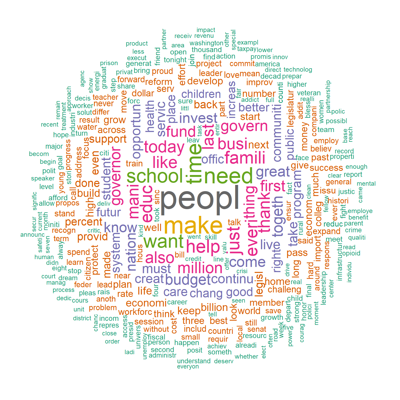 An alternative way to look at the words frequencies is to use a wordcloud. We will do so first, for all governors, then by party affiliation. Before that, we remove the words state, will, and year from the data. I am assuming that they are not important since they are so common in all speeches.