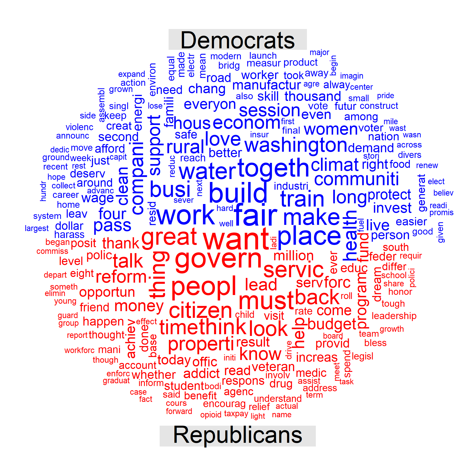 The wordcloud above indicates that people, education, health, business, family, budget are all prominent words in the speeches. Let’s look at the wordcloud by party affiliation (Democrats vs. Republicans).