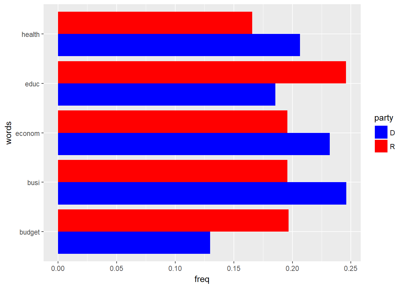 The barplot shows that, relatively, Democrats have used the words health, economy, and business more often than Republicans. The Republicans have used the words education and budget more often than the Democrats.